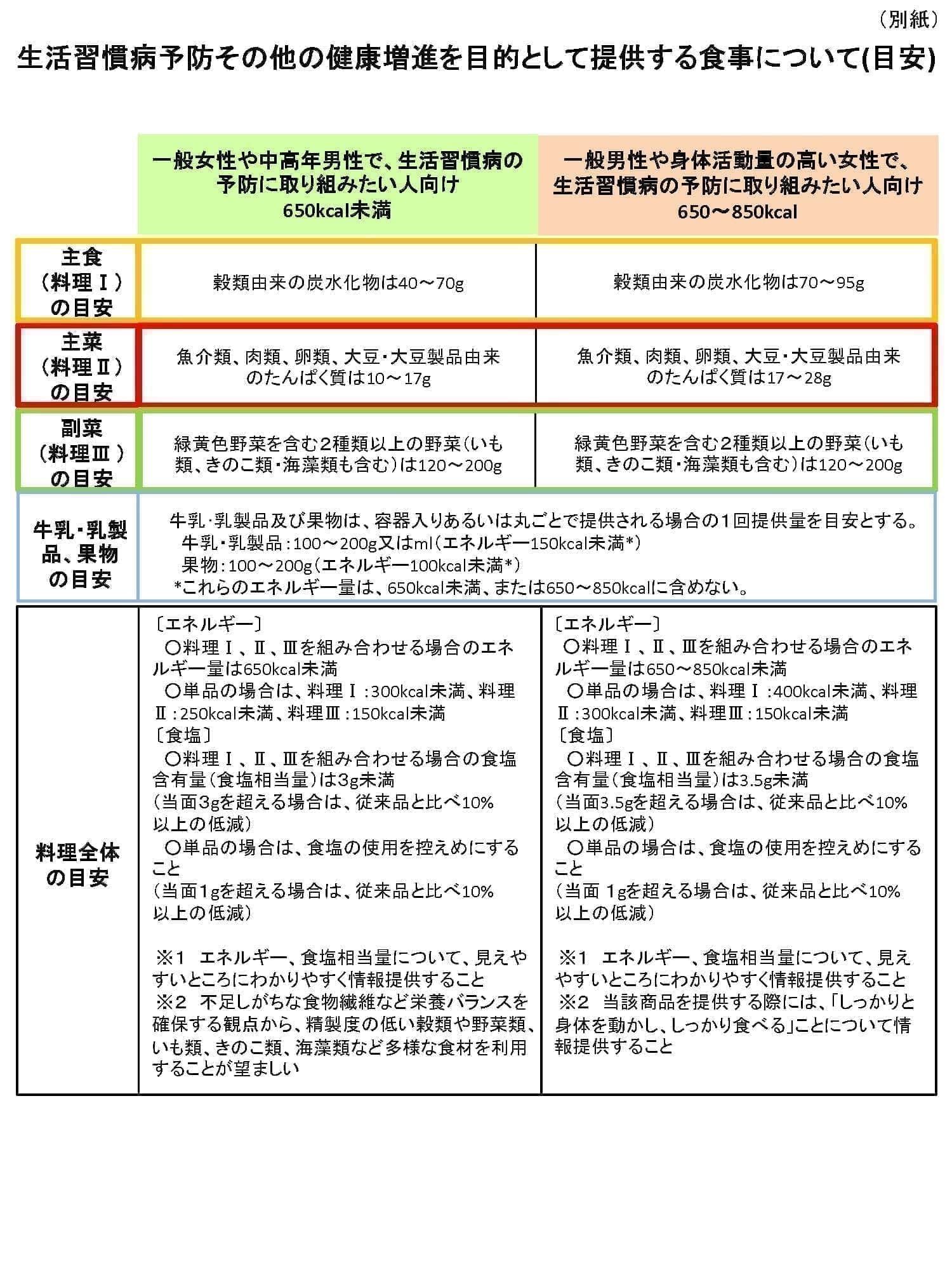 本事業の背景には,平成27年9月に厚生労働省から,日本人の長寿をささえる「健康な食事」の普及に関する健康局長通知が示されたことがあります(厚生労働省:日本人の長寿を支える「健康な食事」の普及について )。この通知では,生活習慣病予防や健康増進の観点から,栄養バランスのとれた食事の普及がさまざまな食事の提供場面で一層の工夫や広がりをもって展開されることを目指し,「生活習慣病予防その他の健康増進を目的として提供する食事の目安」