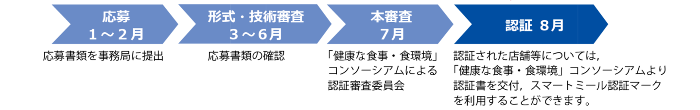 外食・中食・事業所給食で,「スマートミール®(略称スマミル)」を,継続的に,健康的な空間(栄養情報の提供や受動喫煙防止等に取り組んでいる環境)で,提供している店舗や事業所を認証する制度です。