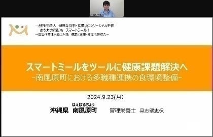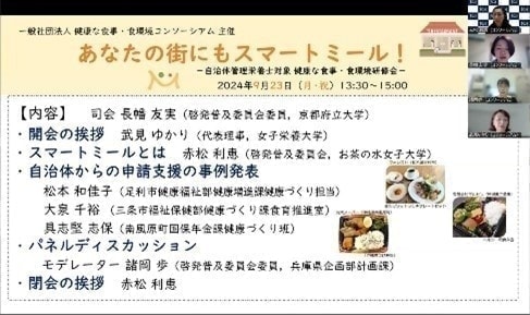 2024年9月23日(月・祝),啓発普及委員会が企画したオンライン研修会「あなたの街にもスマートミール!~自治体管理栄養士対象 健康な食事・食環境研修会~」が開催されました。祝日にも関わらず,全国のみなさまがご参加くださいました。